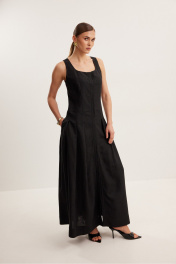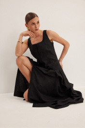 Платье женское , полуприлегающего силуэта . Выполнено из смесового льна.Горловина оформлена квадратным вырезом каре. Платье отрезное ниже талии .Нижняя часть платья со складками . По боковым швам функциональные карманы . Застежка центральная в виде потайной планки с пуговицами .