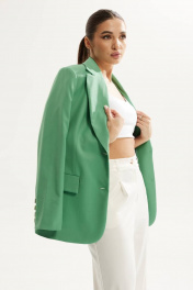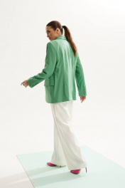 Костюм женский двухпредметный ,свободного силуэта Выполненный из костюмной ткани высокого качества . Жакет с центральной застежкой , рукав втачной двухшовный , внизу рукава шлица. Воротник стояче - отложной с отворотами лацканов . По переду жакета также функциональные карманы с клапанами . Жакет на подкладке. Брюки прямого силуэта, верх брюк обработан притачным поясом . В верхней части брюк расположены карманы .