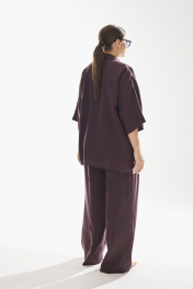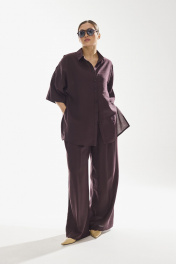 Комплект женский двухпредметный. Блузка женская свободного силуэта , выполненная из качественной вискозы . Воротник рубашечного типа , застежка центральная в виде планки на петли и пуговицы . Линия плеча спущена . По боковым швам в блузке разрезы . Брюки свободного силуэта . Выполнены из качественной вискозы . Верх брюк обработан притачным поясом с резинкой , застежка в виде молнии , по переду брюк функциональные боковые карманы и складки .