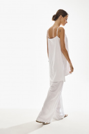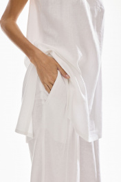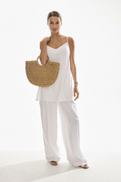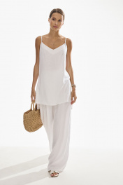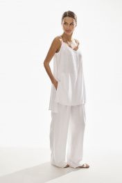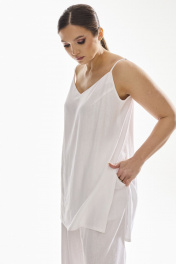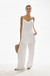 Комплект женский двухпредметный. Блузка женская , прямого силуэта на бретелях . Низ фигурный , по боковым швам разрезы . Брюки свободного силуэта . Выполнены из качественного смесового льна . Верх брюк обработан притачным поясом с резинкой , застежка в виде молнии , по переду брюк функциональные боковые карманы и складки .