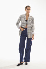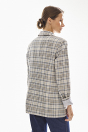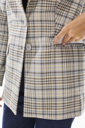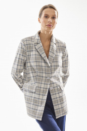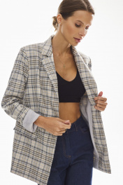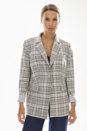 Жакет женский полуприлегающего силуэта , выполненный из костюмной ткани высокого качества . Жакет с центральной застежкой , рукав втачной двухшовный , внизу рукава шлица. Воротник стояче - отложной с отворотами лацканов . По переду жакета также функциональные карманы с клапанами . Жакет на подкладке.