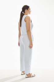 Брюки свободного силуэта заужены к низу, верх брюк обработан притачным поясом с резинкой по спинке . В верхней части брюк расположены карманы и складки.