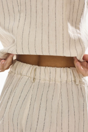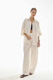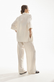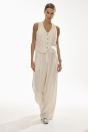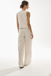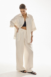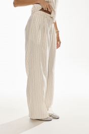 Брюки свободного силуэта . Выполнены из качественной смесовой вискозы . Верх брюк обработан притачным поясом с резинкой , застежка в виде молнии , по переду брюк функциональные боковые карманы и складки .