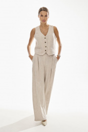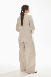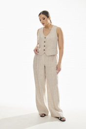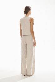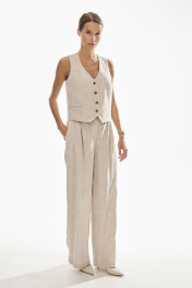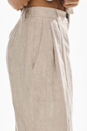Брюки свободного силуэта . Выполнены из качественного 100 % льна . Верх брюк обработан притачным поясом с резинкой , застежка в виде молнии , по переду брюк функциональные боковые карманы и складки .