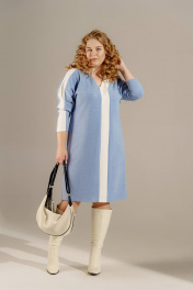 Платье женское из мягкого трикотажного полотна прямого силуэта. Вырез горловины - V образной формы. Рукав отрезной на базе цельнокроеного. По переду и по правому рукаву декоративная вставка из отделочной ткани. Длина по спинке - см, длина рукава от горловины - см.