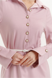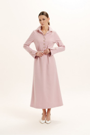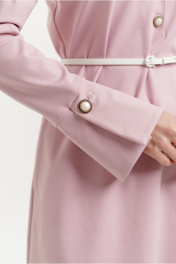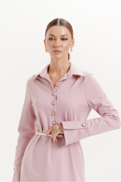Платье прямого силуэта из мягкого трикотажа слегка расширенного к низу, с втачным одношовным рукавом на высокой манжете с застежкой на петлю и пуговицу. Воротник рубашечного типа с отрезной стойкой. По переду обработана застежка - планка на петли и декоративные пуговицы. Спинка со средним швом. В боковых швах обработаны карманы. В комплект входит съемный пояс.