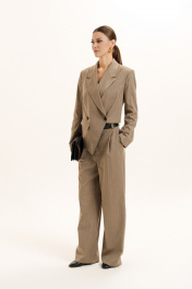 Костюм женский двухпредметный выполнен из костюмно-плательной ткани в полоску. Жакет ассиметричного кроя, прямого силуэта, вырез горловины оформлен воротником пиджачного типа, жакет имеет двубортную застежку на петли пуговицы. По переду, с одной стороны, обработан прорезной карман в рамку с клапаном. Рукава - втачные двухшовные с плечевыми накладками. Брюки - прямые. Пояс - отрезной с застежкой на молнию и петлю с пуговицей и частично на резинке. Имеются карманы с отрезными бочками и шлевки для ремня. Низ брюк обработан закрытым швом.