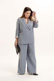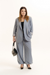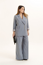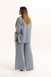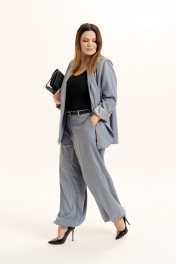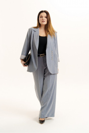 Костюм женский двухпредметный выполнен из костюмной ткани в полоску. Жакет прямого силуэта на подкладке. Вырез горловины оформлен воротником пиджачного типа с застежкой на петли и пуговицы. На листочку, окат рукавов и вход в карманы брюк настрочены отделочные детали с необработанным срезом в стиле Шанель. Рукава - втачные двухшовные с плечевыми накладками. На полочке обработаны накладные карманы. Брюки - прямые. Пояс - отрезной с застежкой на молнию и петлю с пуговицей и частично на резинке. Имеются карманы с отрезными бочками и шлевки для ремня. Отделочная фурнитура может меняться.