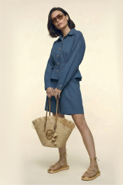 Комплект женский двухпредметный из ткани тенсел. Блузка - приталенная за счёт мягких встречных складок в области талии. Рукава - со спущенной линией плеча на базе цельнокроеных. Низа оформлены отрезанными манжетами с застёжкой на петли с пуговицами. Вырез горловины – воротник рубашечного типа с отрезной стойкой. Застёжка – отрезная планка на петли с пуговицами. Шорты – бермуды свободного покроя. Пояс – отрезной с эластичной тесьмой. В боковых швах имеются карманы.