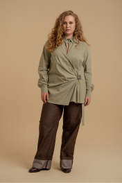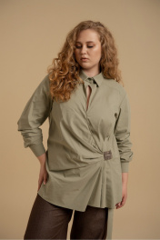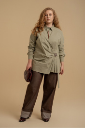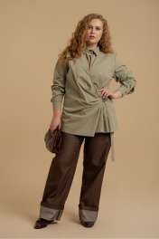 Блузка женская свободного силуэта из хлопковой ткани. Вырез горловины оформлен воротником рубашечного типа. Рукава - втачные с манжетами. На передних половинках - кокетки. Застежка выполнена в виде запаха с драпировками в области талии. Декорировано пришивной аппликацией.