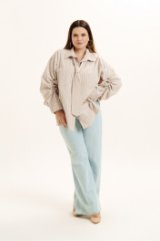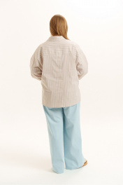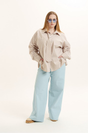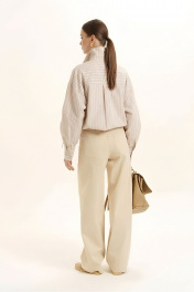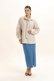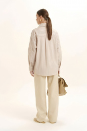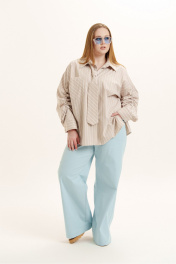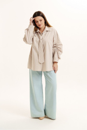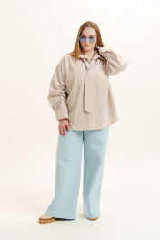 Блуза свободного покроя из хлопковой ткани. Горловина оформлена воротником рубашечного типа. Застежка - планка с петлями и пуговицами. На спинке - кокетка с планкой и закрепками. Рукава - втачные со спущенной линией плеча, снизу - манжеты с застежкой на петли с пуговицами и кулисой по рукаву. По переду с одной стороны обработан накладной карман. В комплект входит съемный галстук.