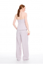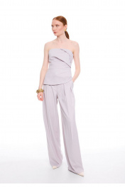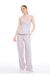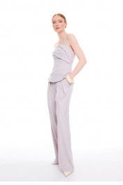 Брюки - палаццо сочетают в себе утонченный стиль и непревзойденный комфорт. Модель с высокой посадкой на талии подчеркивает силуэт, а свободный крой обеспечивает легкость движений. Притачной пояс с застежкой на два крючка и потайную кнопку создает идеальную посадку. Изящные односторонние складочки по линии талии спереди добавляют модели элегантности, а фигурные вытачки сзади обеспечивают безупречную посадку по фигуре. Боковые карманы, аккуратно встроенные в швы, и стильные прорезные карманы с листочками сзади делают эти брюки не только красивыми, но и практичными. Премиальная обработка всех швов и внимание к каждой детали подчеркивают высокое качество этой модели.