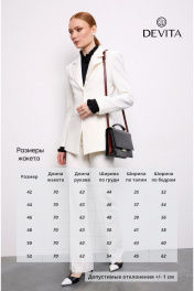 Элегантный женский жакет из благородной смесовой вискозной ткани, станет незаменимым элементом вашего гардероба! Жакет на подкладке, полуприлегающего силуэта, длиной до линии бёдер, идеально подчеркивает фигуру и добавляет изысканности любому образу. Жакет сочетает в себе классические элементы с современным стилем. Передняя часть жакета украшена выточками пиджачного типа и горизонтальными боковыми карманами с обтачками, что придаёт ему особую функциональность и шарм. На левой стороне имеется имитация верхнего кармана с листочкой — стильный акцент, который выделяет этот жакет среди остальных. Спинка жакета оформлена талиевыми выточками и рельефными швами, что создает идеальную посадку. Средний шов заканчивается шлицей, придавая жакету динамичность и комфорт. Воротник пиджачного типа с отрезной стойкой и острыми углами лацканов придаёт жакету строгости и элегантности. Двухшовные втачные рукава с отделочной строчкой спереди и открытыми шлицами добавляют изюминку, а аккуратные пуговицы на шлицах завершают образ. Статусная вещь с различными вариантами стилизации и комплектации с изделиями бренда DEVITA. К жакету идеально подходят брюки арт.3027-1 и блузка-топ арт. 6041-1 из аналогичной ткани и цвета из нашего ассортимента, для создания полного комплекта. Измерения готового изделия расположены в табличке с фотографиями.
