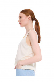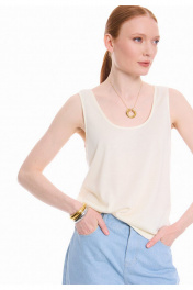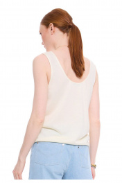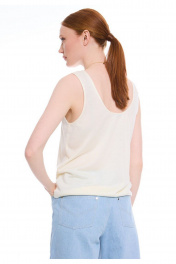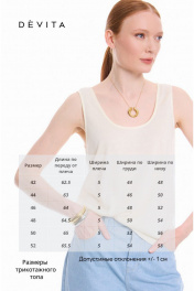 Трикотажный топ природного трендового оттенка "сливочного масла". Прямой силуэт, длиной до линии бёдер. Округлая углубленная горловина обработана бейкой в тон. Удачное дополнение для повседневного образа.