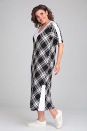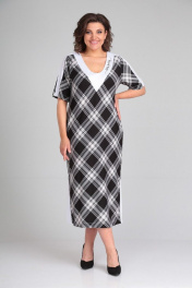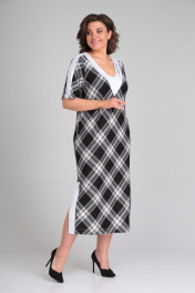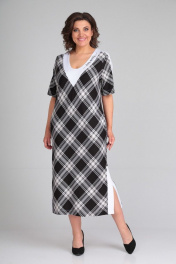 Платье женское полуприлегающего силуэта, длиной до середины икры.Спинка и перед с округлыми бейками из отделочной ткани по горловине, а по боковым швам снизу образуется шлицы с бейками из отделочной ткани. Рукав втачной с полосой по середине из отделочной ткани. Горловина переда V-образная с отрезной отделкой. Низ рукава и низ изделия с отделочной строчкой-3 см.