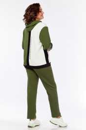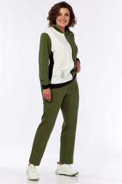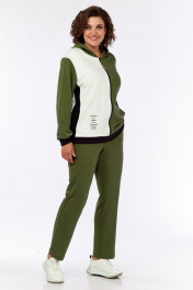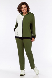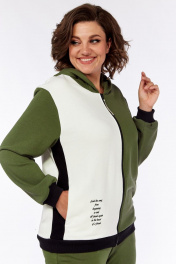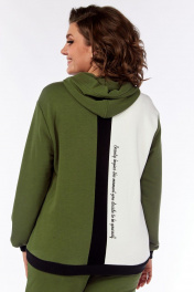 Комплект брючный из трикотажного полотна 3-х цветов, брюки зауженные с поясом на резинке, со шнуром и боковыми карманами в швах. Толстовка с застёжкой "молния". Спинка с полосой по центру из отделочной ткани и печатью по светлой детали. Перед с бочками из отделочной ткани. Правая часть светлая украшена печатью. Карманы боковые обработаны в швах рельфах. Воротник-капюшон. Рукав втачной одношовный. По низу изделия и рукавов -довязы.