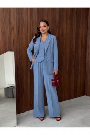 Костюм женский, состоящий из жакета, жилета и брюк. Жакет полуприлегающего силуэта, длинной ниже линии бедер. Спинка с вертикальными рельефами. Перед с центрально-бортовой застежкой на 2 петли- пуговицы и воротником пиджачного типа, вертикальными рельефами, доходящими до линии кармана в рамку с клапаном. Рукава втачные двухшовные. Жакет на подкладке. Брюки - палаццо с центрально застежкой на тесьму молнию с гульфиком и откоском; с притачным поясом со шлевками, застегивающимся на 1 прорезную петлю и пуговицу. Задняя часть пояса - на резинке. ПП брюк со складками, переходящими в стрелки и боковыми карманами. ЗП брюк с 2-мя парами таллиевых вытачек и стрелками. Жилет прилегающего силуэта с центральной бортовой застежкой на 4 прорезные петли и пуговицы. Перед - с талиевыми вытачками и отрезным бочком. Спинка со средним швом и рельефами от проймы до низа, в которые на уровне талии втачаны хлястики. Хлястики с запахом; закреплены на 2 пуговицы. Вырез горловины V-образный. Жилет на подкладке. Длина жакета - 71,2 см Длина рукава жакета - 62,7 см Длина жилета — 49,5 см Ширина плеча жилета — 7,2 — 7,6 см Длина брюк - 120,5 см.