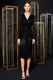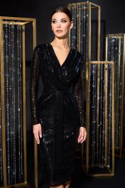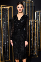 Платье женское полуприлегающего силуэта, из ткани с паетками, на подкладке, отрезное по линии талии. Лиф переда с односторонними складками, в шов обтачивания горловины вставлен кант. Спинка с талевыми вытачками. В среднем шве обработана застёжка на потайную тесьму молнию и разрез. Рукава втачные, одношовные, длинные. Платье украшает пояс из основной ткани.