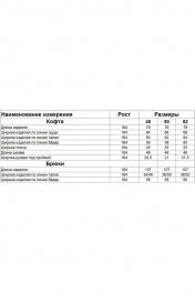 Комплект брючный состоит из кофты и брюк из трикотажного полотна. Кофта с цельнокройной стойкой. Перед с накладным нагрудным карманом с кантом по левой стороне. Рукав втачной одношовный со спущенной линией плеча. По бокам обработаны разрезы. Брюки прямые, широкие. В боковых швах обработаны карманы. Пояс притачной на резинке.