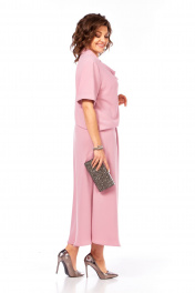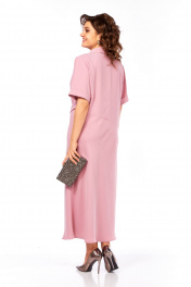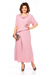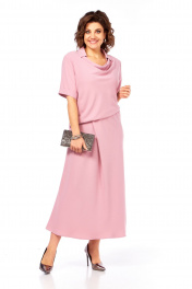 Платье женское длиной до середины икры, слегка расклешенное к низу. Спинка с косым передом в области талии и средним швом до разреза. Перед с косым подрезом в области талии, образующий мягкую складку из лифа и 1 глубокую складку от подреза вниз. Горловина с рубашечным воротником на стойке и драпировкой в виде качели. Рукав втачной с отложными манжетами. Длина по спинке 130 см, длина рукава 26 см.