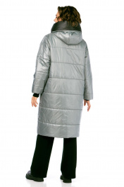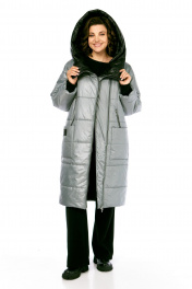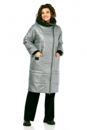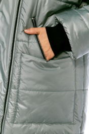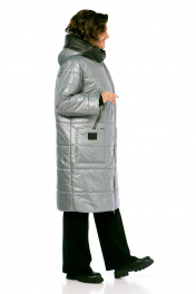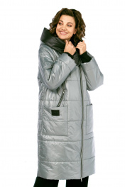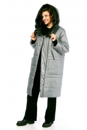 Пальто женское утепленное свободного кроя с ассиметричной застежкой на "молнию". Перед с прорезными карманами с "молнией" и накладными карманами. Правый накладной карман с отделочной нашивкой. Рукав втачной одношовный с трикотажным манжетом выходящим из-под подгибки. Объмный капюшон выполнен из 2-ух видов ткани. Утеплитель Hoopon 200, температурный режим до -10 градусов. Длина по спинке 107, длина рукава 61+5 см.