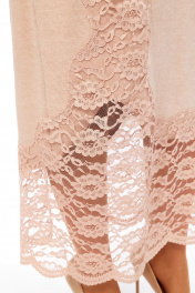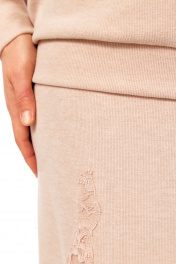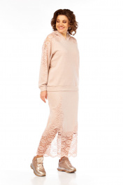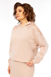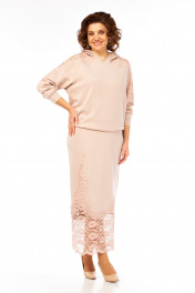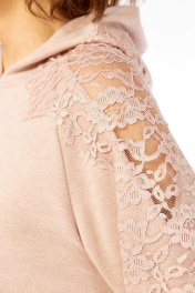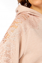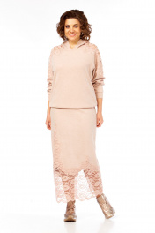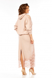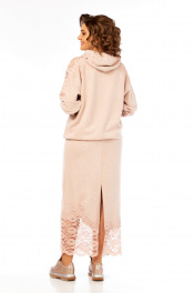 Комплект женский с юбкой. Кофта свободного кроя покроя реглан, по низу изделия и низу рукава манжет. Капюшон со средним швом. В качестве отделки используется кружево по рукаву и капюшона. Юбка прямая со средним швом по спинке, заканчивающийся разрезом. Талиевые вытачки. Верхний срез обработан поясом с резинкой. В качестве отделки используется кружево по низу изделия. Длина по спинке 67 см. Ширина плеча+длина рукава 70 см. Длина юбки 96 см.