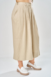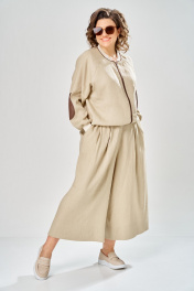 Комплект брючный состоит из кофты-бомбера и брюк-кюлотов. Кофта с центральной застежкой на молнию. Спинка украшена сверху нашивкой. Правая полочка с нагрудеым карманом с рамкой и нашивкой. Рукав-реглан с заплаткой на локте. По низу рукава, горловине и низу кофты трикотажный довяз. Вдоль горловины и по бортам кант из отделочной ткани. Брюки-кюлоты прямые, широкие. Передние половинки брюк с 2-мя мягкими складками, боковыми карманами и застежкой на молнию. Пояс по спинке на резинке. Длина по спинке 64 см, длина рукава +ширина плеча 72 см. Длина брюк-кюлот 90 см. Кофта 46 48 50 Длина изделия 64 64 64 Ширина изделия по линии груди 59 61 63 Ширина изделия по линии талии 57 59 61 Ширина изделия по линии бёдер 57 59 60 Ширина плеча+длина рукава 72 72 72 Ширина рукава 22 23 24 Брюки-кюлоты Длина изделия 90 90 90 Ширина изделия по линии талии 38/43 40/45 42/47 Ширина изделия по линии бедер 58 60 62