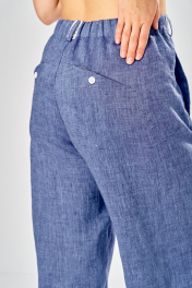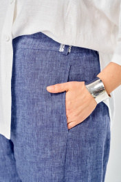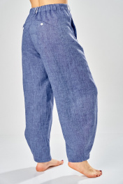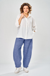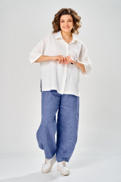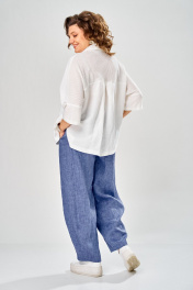 Комплект брючный состоит из рубашки и брюк. Рубашка со спущенным плечом, с застежкой на петли и пуговицы. По спинке кокетка, по шву притачивания нижней части заложена складка, по боковым швам-разрезы. Рукав втачной одношовный короткий. Воротник стояче-отложной с отрезной стойкой. Используются две ткани. Брюки расширенные к низу. На задней половинке-кокетка, обработаны карманы в шве с застежкой на петлю-пуговицу. По переду в рельефном шве бочка обработаны карманы. Застежка на тесьму-молнию, петлю-пуговицу. Верхний срез обработан поясом с резинкой. По поясу-шлёвки. В качестве отделки используется фурнитура, отделочная строчка. Длина по спинке 74 см, ширина плеча+длина рукава 56 см. Длина брюк 107 см.