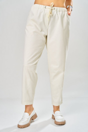 Комплект брючный состоит из кофты и брюк. Кофта свободного кроя со спущенным плечом, по переду рельефные швы, деталь из отделочной ткани, пояс притачной, молния по спинке, отрезной пояс. Рукав втачной одношовный, укороченный. Горловина обработана бейкой. Брюки зауженные к низу, застрочены вытачки, на передних половинках на уровне колена застрочены вытачки. В боковых швах обработаны карманы с листочкой, на задней половинке-накладные карманы. Пояс с резинкой, регулируется с помощью шнура. Длина по спинке 56 см, длина рукава 37 см. Длина брюк 96 см.