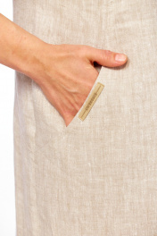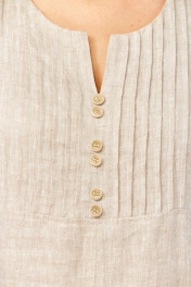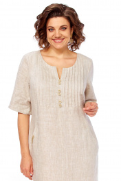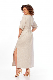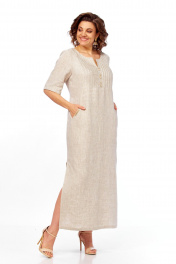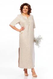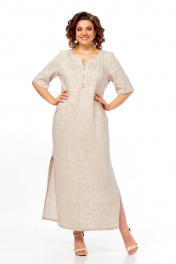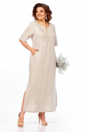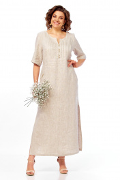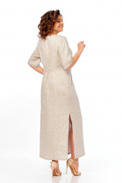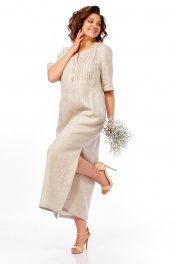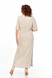 Платье женское полуприлегающего силуэта длиной до щиколотки. Спинка со средним швом и рельефами от плеча до бедер. Центральная часть спинки растрочена на кулису с резинкой в области талии. Перед со средним швом и отрезными бочками от плеча до линии бедер. Верхняя часть с застроченными защипами и средним швом. Нижняя часть переда со средним швом, карманы обработаны в швах рельефов. Рукав втачной одношовный . По бокам разрезы. Длина по спинке 133 см, длина рукава 32 см.