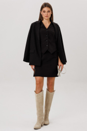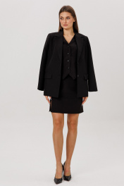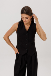 Жилет полуприлегающего силуэта с центральной бортовой застежкой на 4 прорезные петли и пуговицы. На модели брюки м 033. Длина жилета — 49,5 см Ширина плеча жилета — 7,2 — 7,6 см