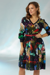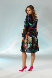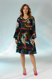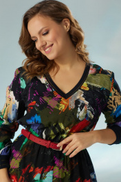 Легкое, воздушное платье а-образного силуэта из текстильной креповой вискозы с дизайнерским принтом. Платье с отрезным лифом и резинкой по линии талии, v-образным вырезом горловины оформленной довязом, длинным рукавом ,низ которого оформлен манжетой из довяза. В комплект к платью входит ремень.
