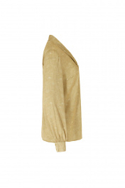 Блузка женская, прямого силуэта, внизу боковых швов разрезы. По переду имитация застежки - навесные петли и пуговицы. Втачной рукав с притачной манжетой на 2 пуговицы и петли. Низ рукава на сборке. В комплекте съемный шарф, который пристегивается на 3 петли и пуговицы по горловине спинке.