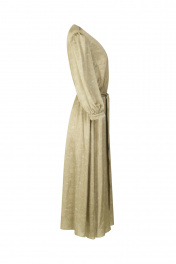 Платье женское, по талии отрезное на резинке, расширенное книзу, на подкладке. Длиной ниже колена. В верхней части переда имитация застежки на навесные петли и пуговицы. Рукав втачной, одношовный, в верху на сборке, с притачной манжетой, застегивающейся на 1 петлю и пуговицу