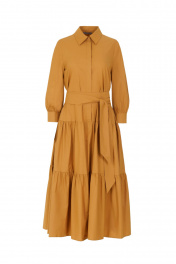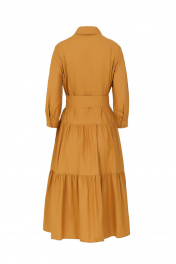 Платье женское, расширенное к низу. Длиной ниже колена. Нижние части переда и спинки с двумя притачными воланами на сборке. По переду планка с потайной застежкой. Воротник рубашечного типа, по стойке воротника застежка на 1 петлю и пуговицу. Рукав втачной снизу на сборке, с притачной манажетой на 2 петли и пуговицы. Платье со съемным поясом.