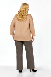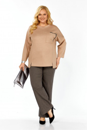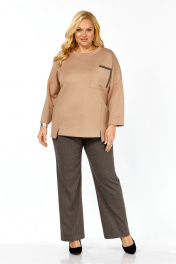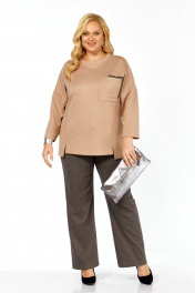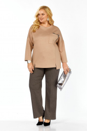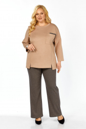 Комплект 2-ух предметный, состоит из блузки и брюк. Очень удобная, уютная блуза из трикотажного полотна. Изделие полуприлегающего силуэта. Горловина аккуратной округлой формы. Рукав втачной, линия плеча спущена полной длины. Декоративным элементом является накладной карман, который выполняет не только практичную, но и эстетичную функцию, добавляя изделию стиль и индивидуальность. Низ ассиметричный в боковых швах предусмотрены разрезы. Спинка со средним швом. Брюки прямого кроя, спереди обработаны боковые скошенные функциональные карманы. Пояс притачной, частично на резинке, что обеспечивает комфортную посадку. Застежка спереди брюк на молнию и петлю-пуговицу. Ткань обеспечит уют в осеннюю погоду, сохраняя тепло