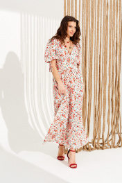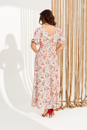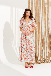 Платье полуприлегающего силуэта, расклешенное книзу, отрезное по линии талии, с V-образным вырезом горловины и застежкой на тесьму-молнию в среднем шве спинки. Перед с отрезным лифом. Спинка со средним швом и отрезным поясом со сборкой на эластичную тесьму. Рукав втачной короткий, со сборкой по верхнему и нижнему срезам. Нижний срез рукава на резинке, дополнен декоративными завязками. Длина изделия на модели от плечевого шва до низа — 134,5 см (допустимое отклонение +/- 1 см)