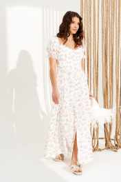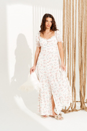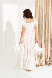 Платье полуприлегающего силуэта, расклешенное книзу, отрезное по линии талии, с центральной застежкой на петли и пуговицы и фигурным вырезом горловины. Верхние детали переда с рельефами и отрезными чашками. Нижние детали переда и спинки с рельефами и двумя рядами притачных воланов со сборкой по верхним срезам. Верхняя деталь спинки с рельефами. Центральные части спинки прострочены эластичной тесьмой. Рукав втачной, короткий. Окат и низ рукава обработаны эластичной тесьмой. Низ рукава и горловина переда оформлены кружевом. Длина изделия на модели вдоль середины спинки — 126,5 см (допустимое отклонение +/- 1 см)