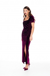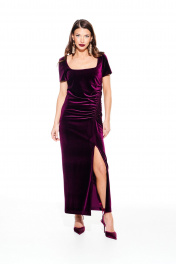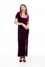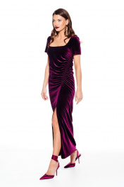 Платье из бархата на трикотажной основе, полуприлегающего силуэта, с фигурным вырезом горловины. По переду нагрудные вытачки, рельеф со сборкой на резинку и разрез. Спинка цельная. Рукав втачной, короткий. Длина платья до щиколотки.