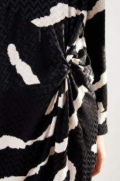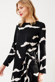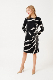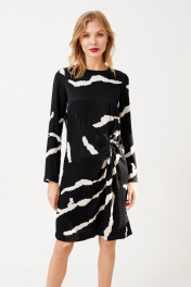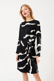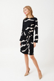 Платье женское, полуприлегающего силуэта, длиной до середины линии колен из костюмно-плательной ткани. Перед с подрезом переходящим в декоративную драпировку-узел. В среднем шве спинки платья потайная застежка молния. Рукав одношовный, втачной, длинный. Вырез горловины круглый. длина изделия - 98 см длина рукава - 59см параметры 42 44 46 48 обхват груди 94 98 102 106 обхват талии 86 90 94 98 обхват бедер 106 110 114 118 обхват рукава 34 36 38 40