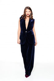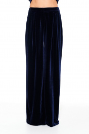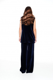Брюки из бархата на трикотажной основе, свободного объема, расширенные к низу. На передних половинках выполнены боковые карманы с отрезным бочком и встречные складки. На задних половинках талиевые вытачки. Застежка – гульфик на молнии. Пояс притачной, с резинкой по спинке, застежкой на крючок и потайную пуговицу.