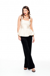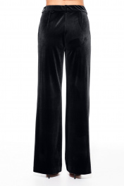 Брюки из бархата на трикотажной основе, умеренного объема, прямого силуэта. На передних половинках выполнены боковые карманы с отрезным бочком. Задние половинки с талиевыми вытачками. Застежка – гульфик на молнии. Пояс притачной, с резинкой по спинке, шлевками, застежкой на крючок и потайную пуговицу.