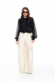 Брюки свободного объема, расширенные к низу. На передних половинках выполнены боковые карманы с отрезным бочком и встречные складки. На задних половинках талиевые вытачки. Застежка – гульфик на молнии. Пояс притачной, с резинкой по спинке, застежкой на крючок и потайную пуговицу.