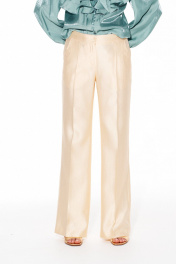 Брюки умеренного объема, прямого силуэта. На передних и задних половинках заутюжены стрелки. На передних половинках выполнены боковые карманы с отрезным бочком. Задние половинки с талиевыми вытачками. Застежка — гульфик на молнии. Пояс притачной, с резинкой по спинке, застежкой на 1 петлю и 1 пуговицу.