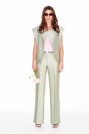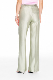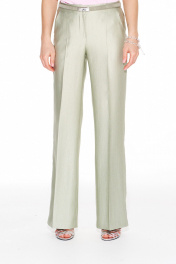 Брюки умеренного объема, прямого силуэта. На передних и задних половинках заутюжены стрелки. На передних половинках выполнены боковые карманы с отрезным бочком. Задние половинки с талиевыми вытачками. Застежка — гульфик на молнии. Пояс притачной, с резинкой по спинке, застежкой на 1 петлю и 1 пуговицу.