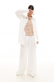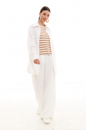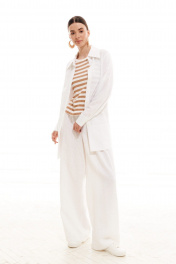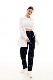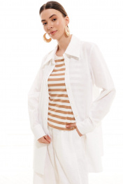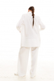 Блузка женская, прямого силуэта, длиной ниже линии бедер из плательно-блузочной ткани. Перед с нагрудными вытачками, цельнокроеными планками и застежкой на петли, пуговицы. Низ обработан широкой планкой - обтачкой. В боковых швах разрезы. Рукав одношовный, втачной, длинный, с разрезом в локтевом шве и притачной манжетой с застежкой на петли, пуговицы. Воротник рубашечный на отрезной стойке.