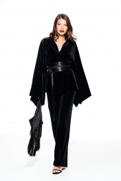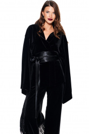 Кардиган из бархата на трикотажной основе, свободого объема, прямого силуэта, на подкладке. Срезы борта и горловины спинки обработаны притачной обтачкой. Линия плеча спущенная. Спинка цельная. Рукав втачной, широкий, в стиле "кимоно". В комплекте пояс из атласной ткани..