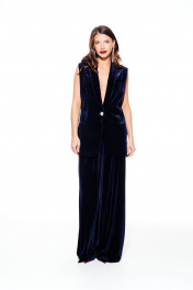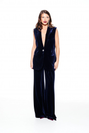 Жилет из бархата на трикотажной основе, прямого силуэта, однобортный, с центральной застежкой на 1 петлю и 1 пуговицу, на подкладке. Детали переда с талиевыми вытачками, отрезными бочками и прорезными карманами в рамку. На левой полочке нагрудный карман с листочкой. Спинка со средним швом и талиевыми вытачками. Воротник – шалевый с фигурным краем.
