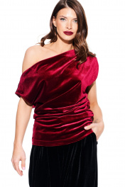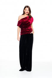 Блуза из бархата на трикотажной основе, умеренного объема, полуприлегающего силуэта с акцентом на одно плечо, с фигурной драпировкой на уровне груди. Вырез горловины в форме лодочки. Левый плечевой и боковой шов оформлены сборкой. Длина до линии бедер.