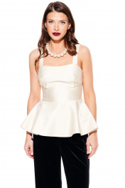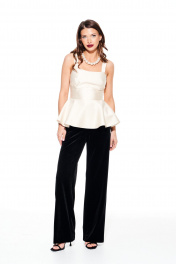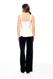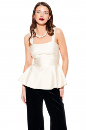 Блузка приталенного силуэта, отрезная на уровне линии талии, на широких бретелях, на подкладке. Перед с отрезной кокеткой, рельефами и нагрудными вытачками. Спинка с рельефами, со средним швом и застежкой на тесьму-молнию. Нижняя часть блузки расклешенная.